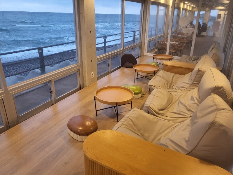 혼자는못해 북한강 뷰 눕카페 캠핑 카페는 통유리창 너머로 북한강이 시원하게 펼쳐지는 구조가 가장 큰 특징입니다. 실내에 앉아 있어도 마치 강변에 나와 있는 듯한 개방감을 느낄 수 있어요. 특히 해질 무렵 노을이 물드는 시간대에는 붉게 물든 강물이 잔잔하게 반짝이며 한 폭의 그림 같은 풍경을 만들어냅니다.